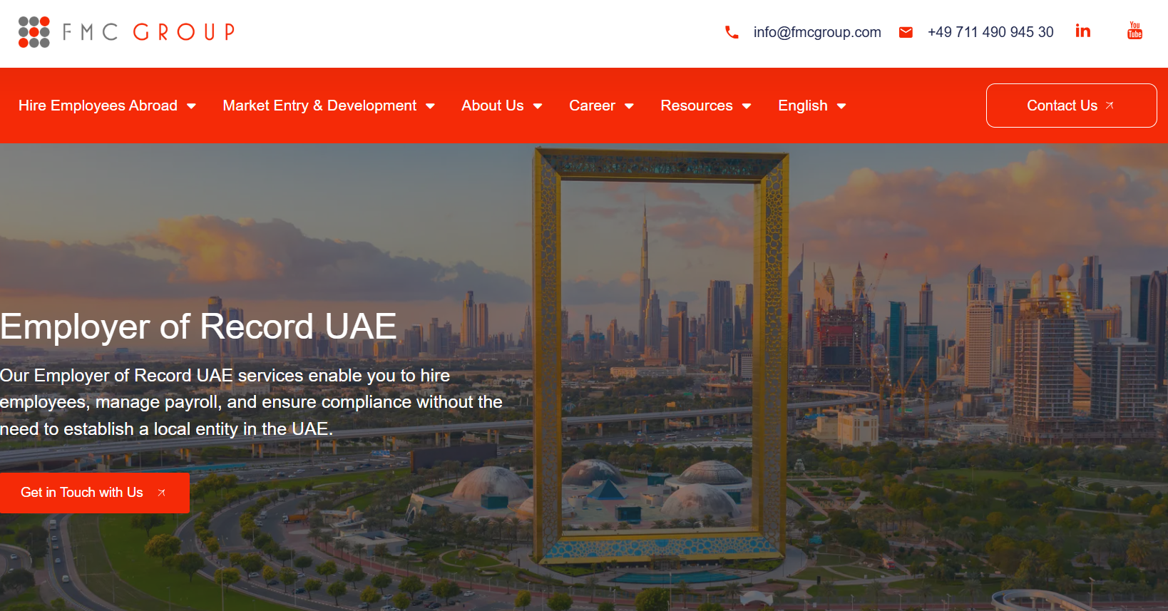 FMC Group provides Employer of Record services across the UAE and the wider Middle East, supporting companies that want to hire locally without establishing a legal entity. Its services include payroll processing, employment contracts, benefits administration, and compliance management, along with optional market entry and recruitment support.