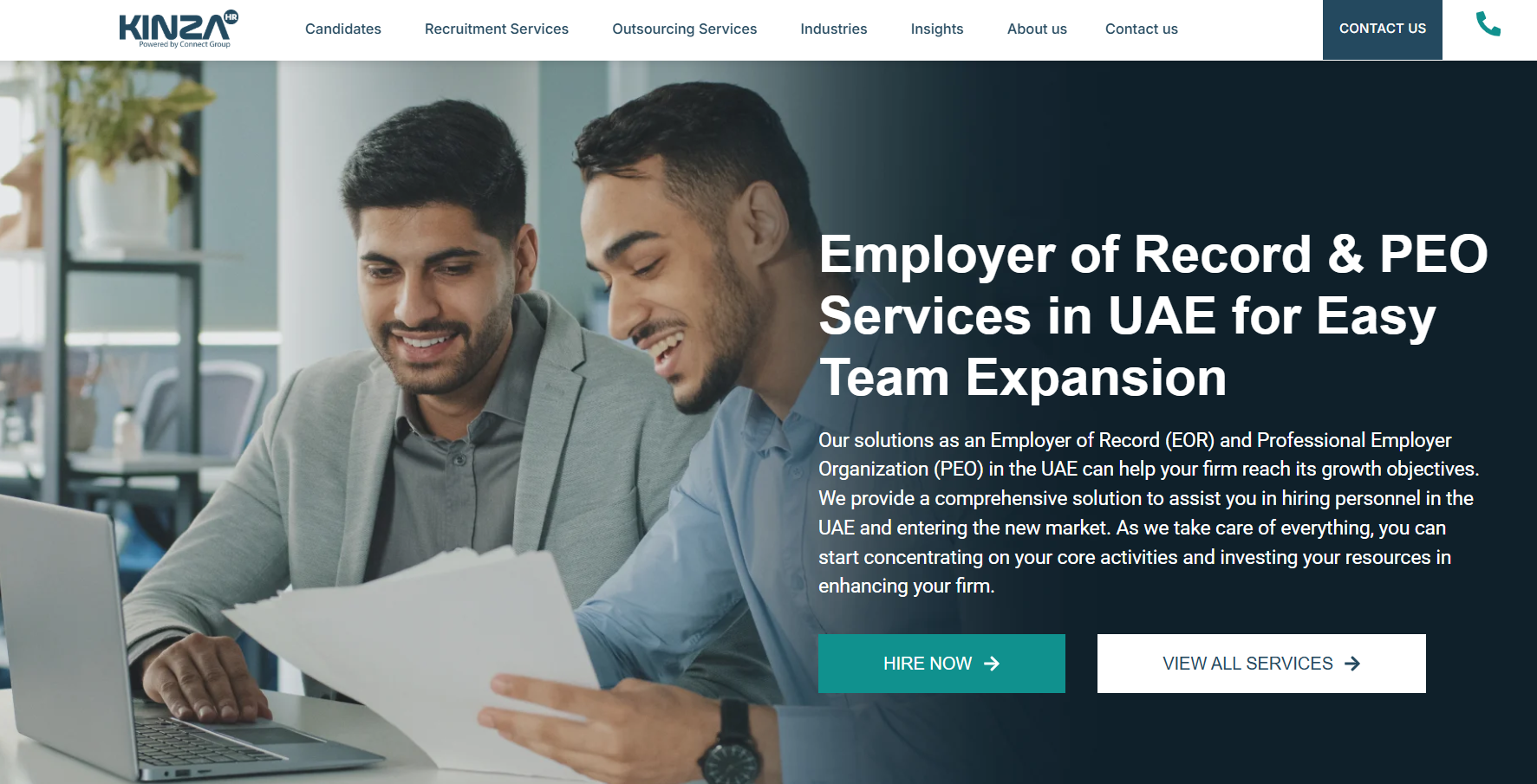 Kinza HR is a Dubai-based Employer of Record and HR services firm specializing in UAE labor law compliance. It supports payroll processing, employment contracts, visa sponsorship, and HR administration. Kinza HR is a strong option for companies that prefer a local partner with on-the-ground expertise and personalized support in Dubai.