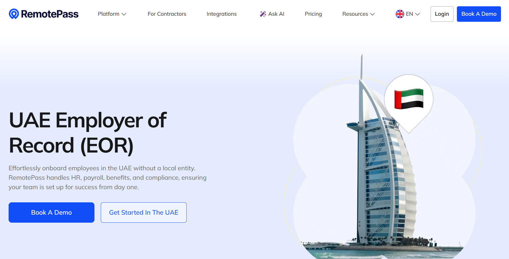 RemotePass is a Middle East–focused EOR platform with strong expertise in UAE and Saudi Arabian employment regulations. It offers localized payroll, employee benefits, visa sponsorship, and compliance management. Its regional specialization makes it a strong choice for companies prioritizing local expertise, cultural alignment, and smooth hiring operations in the Gulf region.